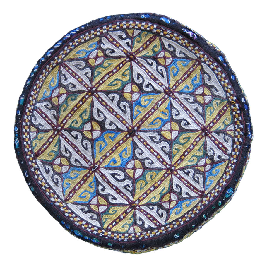 Türkmen Embroidered Hat from Qunduz (Kunduz), Afğanistan (Afghanistan). Many Türkmen tribes had to migrate, take refuge in North Afğanistan after the Soviet invasion of Türkistan in the second half of the 19th century. There are also Özbek (Uzbek), Tocik (Tajik), and Äzrä (Hazara) groups living in this area. This hat is probably from the Türkmen Yomut tribe if we go off the design and embroidery. It has uncommon color shades. Wool embroidery was done on a thick hand machine sewn cotton base. Used and in fairly good condition.