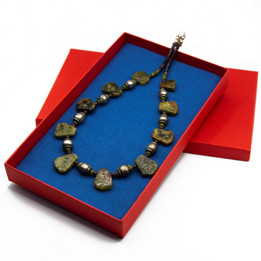This massive statement necklace was hand made of natural green grossular garnet (with red, yellow, deep red color admixtures), purple almandine garnet and nephrite; antique Yemeni and Ethiopian silver beads were used.