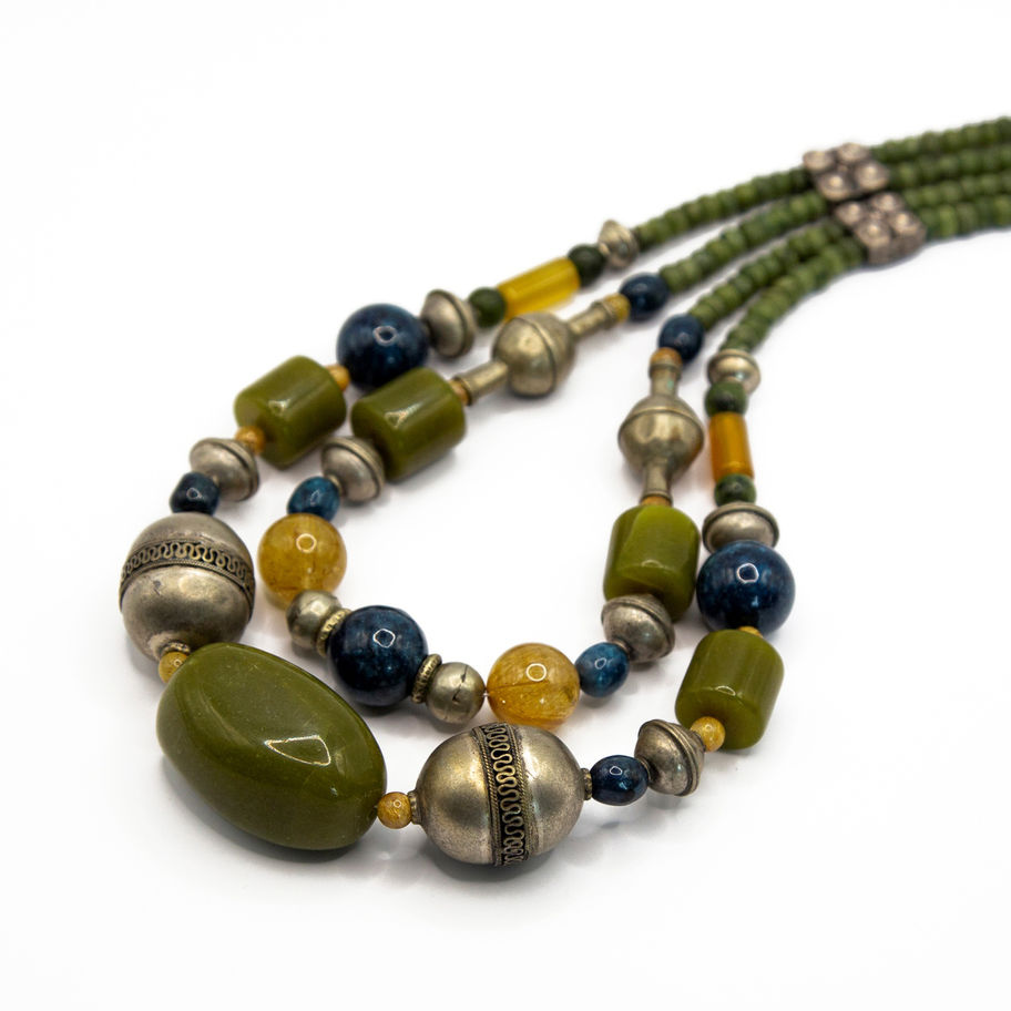 Designer Ethnic Necklace with Silver Turkmen Beads and Jade Apatite Quartz Beads