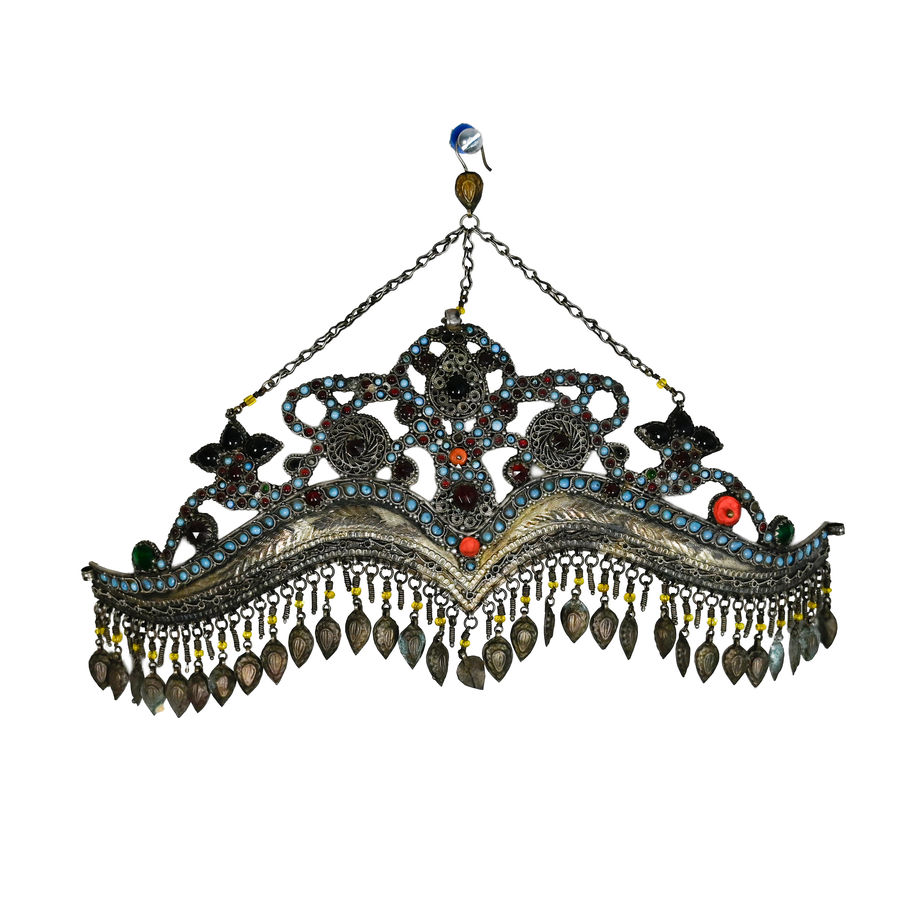 The Tilla Qåş (Tilla Qosh), or "Golden Eyebrows," is an Özbek (Uzbek) and Tacik (Tajik) bridal headdress that symbolizes the purity of the bride. This one is from Buxårå (Bukhara), Özbekistan (Uzbekistan).